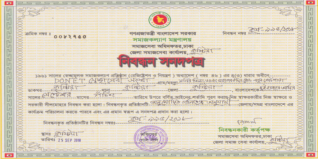 Humanity Foundation is Registered (Reg.No. KUS-995/2018) as a Department of social services under Social Welfare Ministry Bangladesh, (Reg dated 25th Sep, 2018) for receiving foreign donations and grants.
